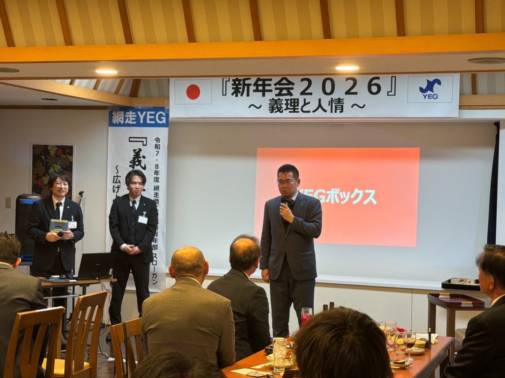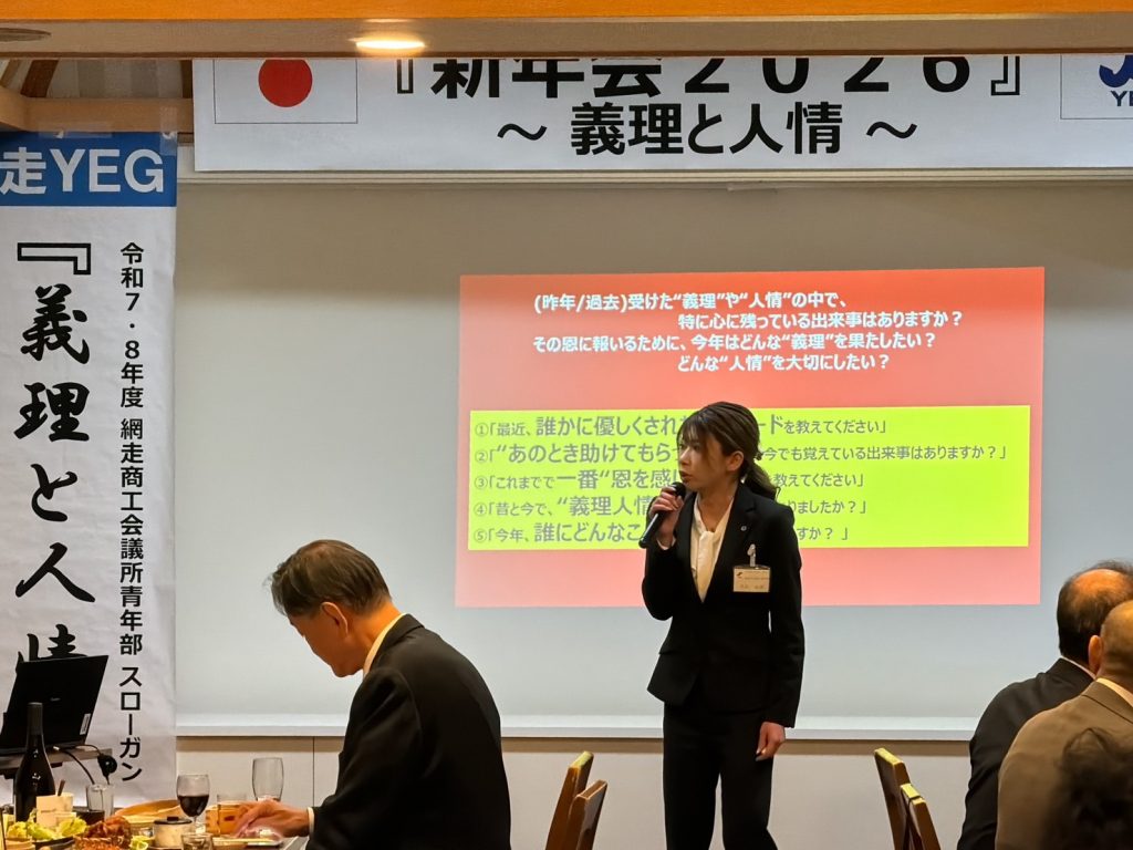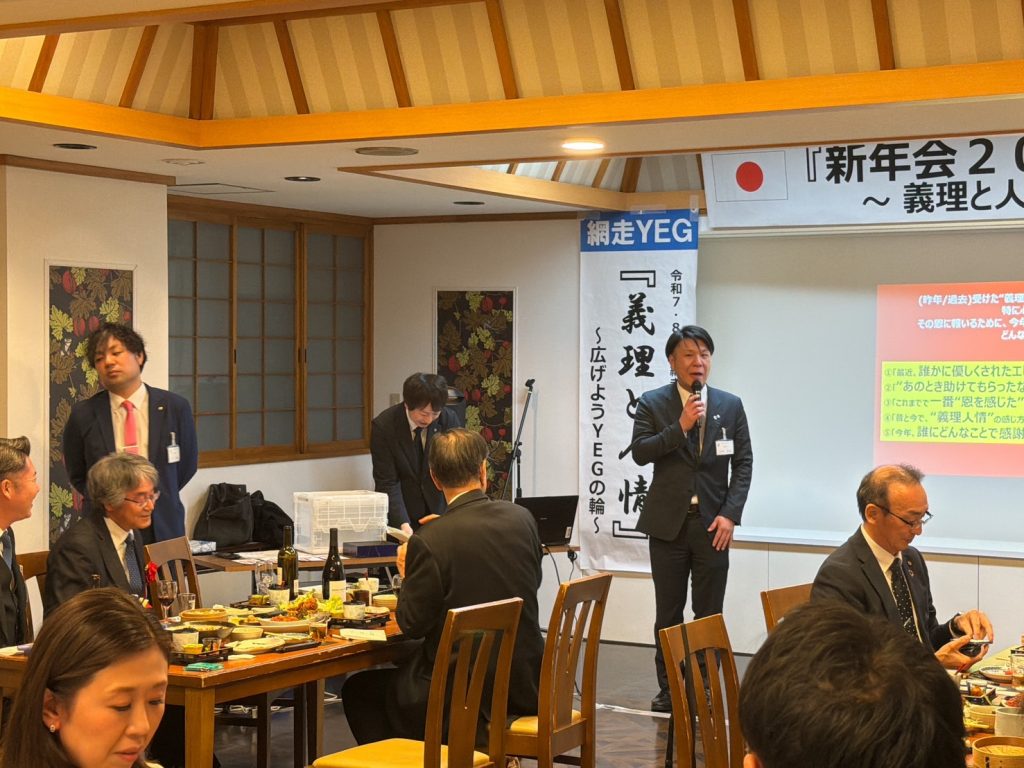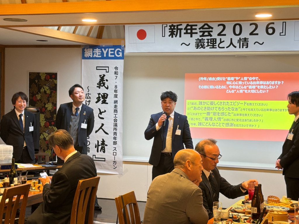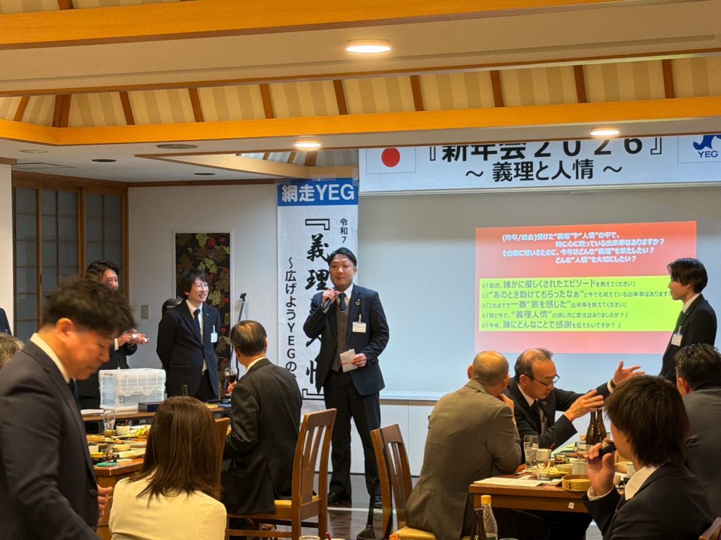 本例会は、ご来賓をお招きし、和やかな雰囲気の中で新たな門出を皆で祝うことができた。冒頭、ご来賓ならびに今野会長による鏡開きが行われ、網走YEGのさらなる発展と成長を祈願した。懇親会では余興として「名前ビンゴ」を実施し、名前を呼ばれた方には、本青年部のスローガンでもある義理と人情にまつわるエピソードや今年の抱負を語っていただいた。ゲームを楽しみながらも、ご来賓および会員相互の親睦と交流を深めることができ、今年一年の網走YEGでの活動に対する意識を高める有意義な機会となった。本例会を通じて、より一層の結束と団結を感じることができ、今後の活動への大きな弾みとなる例会となった。